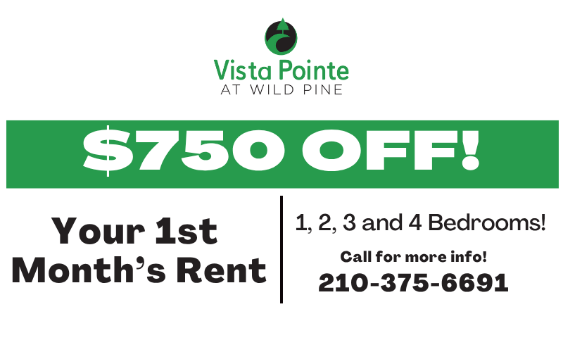 Vista Pointe at Wild Pine Apartments is conveniently located next to San Antonio's shopping, dining, and entertainment. Our community boasts spacious one, two, three, and four bedroom floorplans. Enjoy top notch amenities such as a sparkling swimming pool, clubhouse, business center, and wifi access when you use any of the amenities.